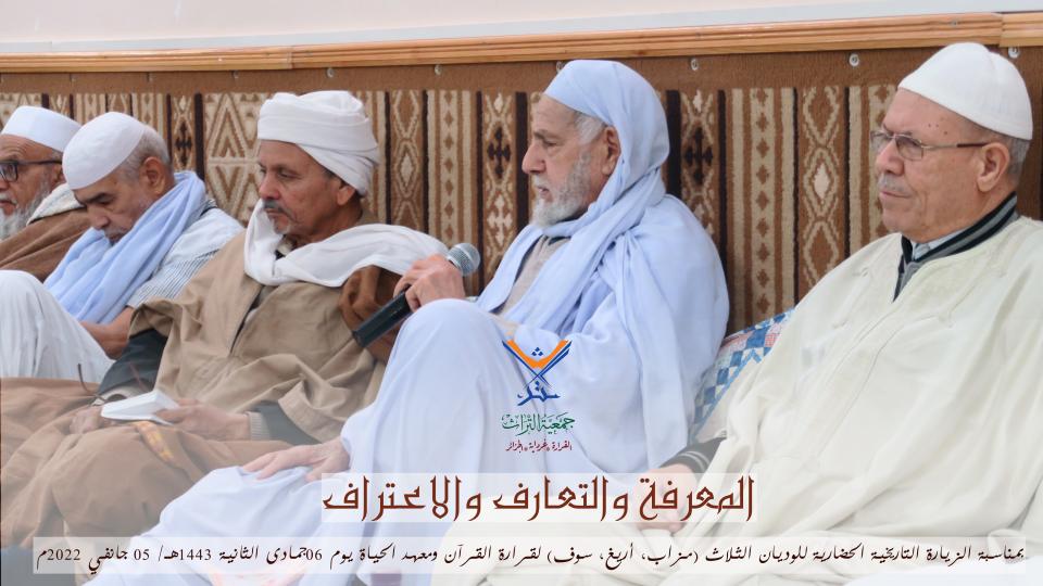 جمع ذلك اليوم المبارك ثلة من مشايخ وأعلام مدينة وارجلان وتوقوت وواد سوف في زيارة هدفها التقرب أكثر من النموذج المزابي وتنظيماته التربوية والاجتماعية وكدا زيارة للمؤسسات التربوية والمعالم التاريخية الحضارية.. وكل ذلك كان في محضن جمعية التراث المحروسة ورعاية جمعية الحياة العريقة وحضور حلقة العزاية الموقرة..