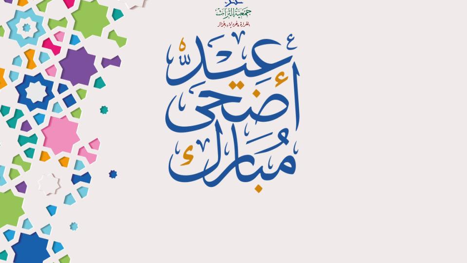 بمناسبة عيد الأضحى المبارك يسر إدارة جمعية التراث أن تزفَّ إليكم أسمى العبارات وأحلى البشارات، سائلين المولى جلَّ وعلا أن تحلَّ علينا هذه المناسبة باليمن والبركات، وينعمَ الجميع بالخير العميم، ونحمد الله تعالى على نعمه وفضائله التي لا تعدُّ ولا تحصى، وأن يعيده علينا وعلى الأمة الإسلامية جمعاء أيامًا عديدة وأزمنة مديدة في أمن ورخاء وانتصار، والحمد لله رب العالمين ...